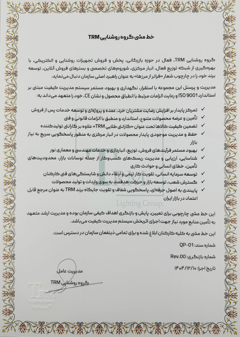 شرکت تجهیزات روشنایی TRM با بیش از ۲۰ سال تجربه ارزشمند در صنعت روشنایی، اجرای پروژههای نورپردازی حرفهای و همچنین ارائه و پخش محصولات باکیفیت بهصورت خرده و عمده در سراسر کشور فعالیت میکند.